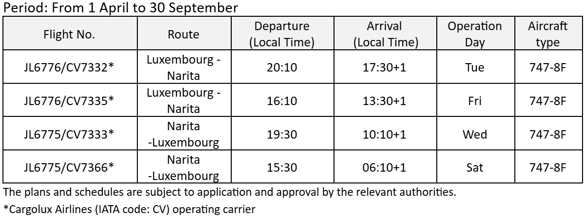 Japan Airlines (JAL) and Cargolux Airlines (CV) are pleased to commence cooperation on the Narita-Luxembourg-Narita and Narita-Chicago-Narita routes starting April 1, 2026.