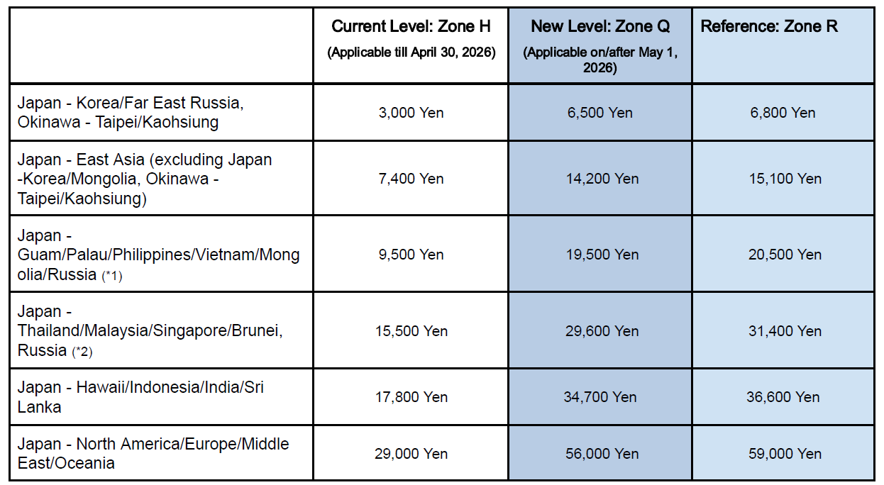 Under the revised application period and amount, the fuel surcharge for tickets issued between May and June 2026 would normally correspond to Zone R. However, reflecting the government subsidy provided as part of emergency mitigation measures in response to the situation in the Middle East during the assessment period (February-March), the fuel surcharge applied to tickets issued between May and June 2026 will correspond to Zone Q.