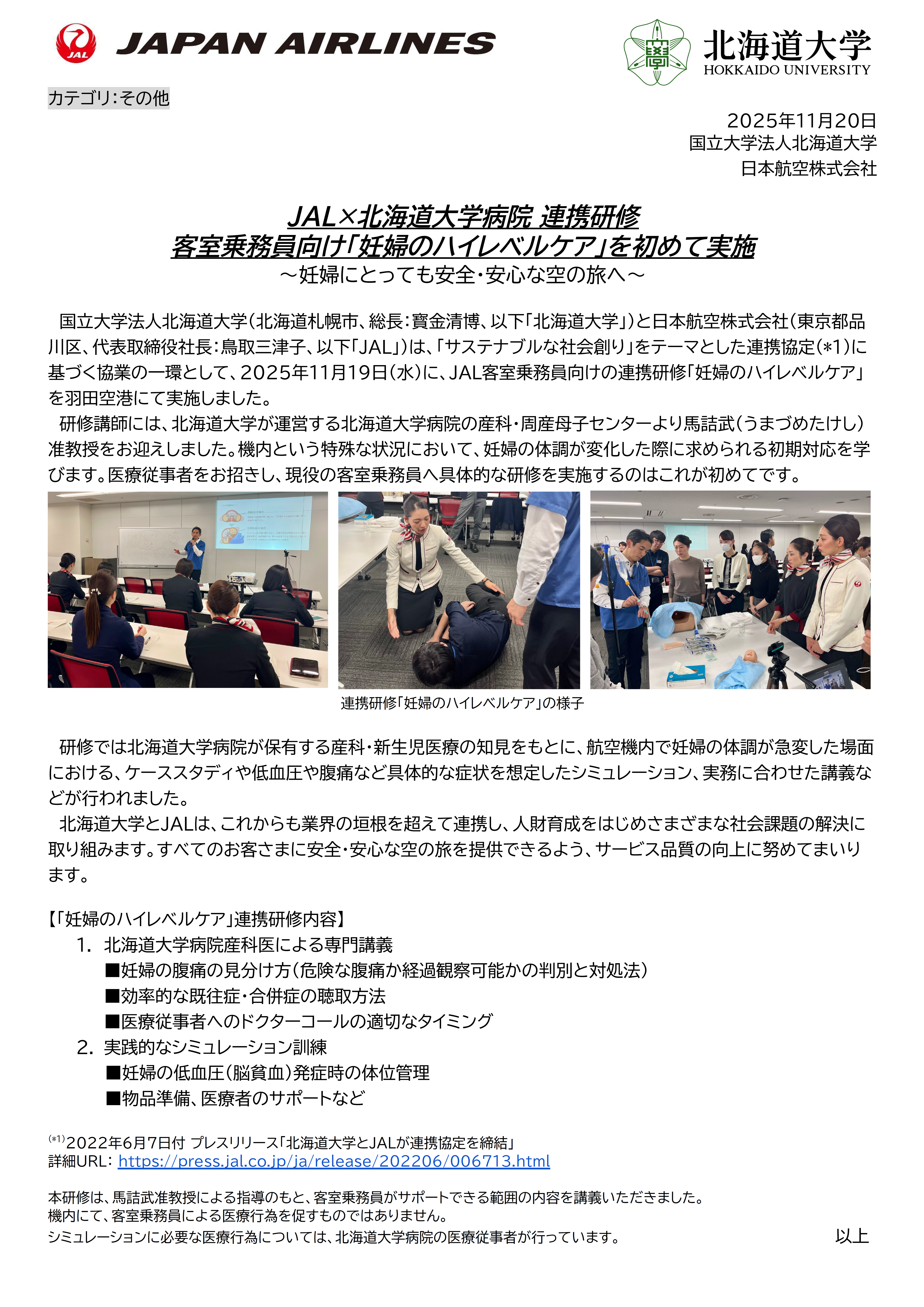 【北海道】(共同リリース)JAL×北海道大学病院 連携研修 客室乗務員向け「妊婦のハイレベルケア」を初めて実施