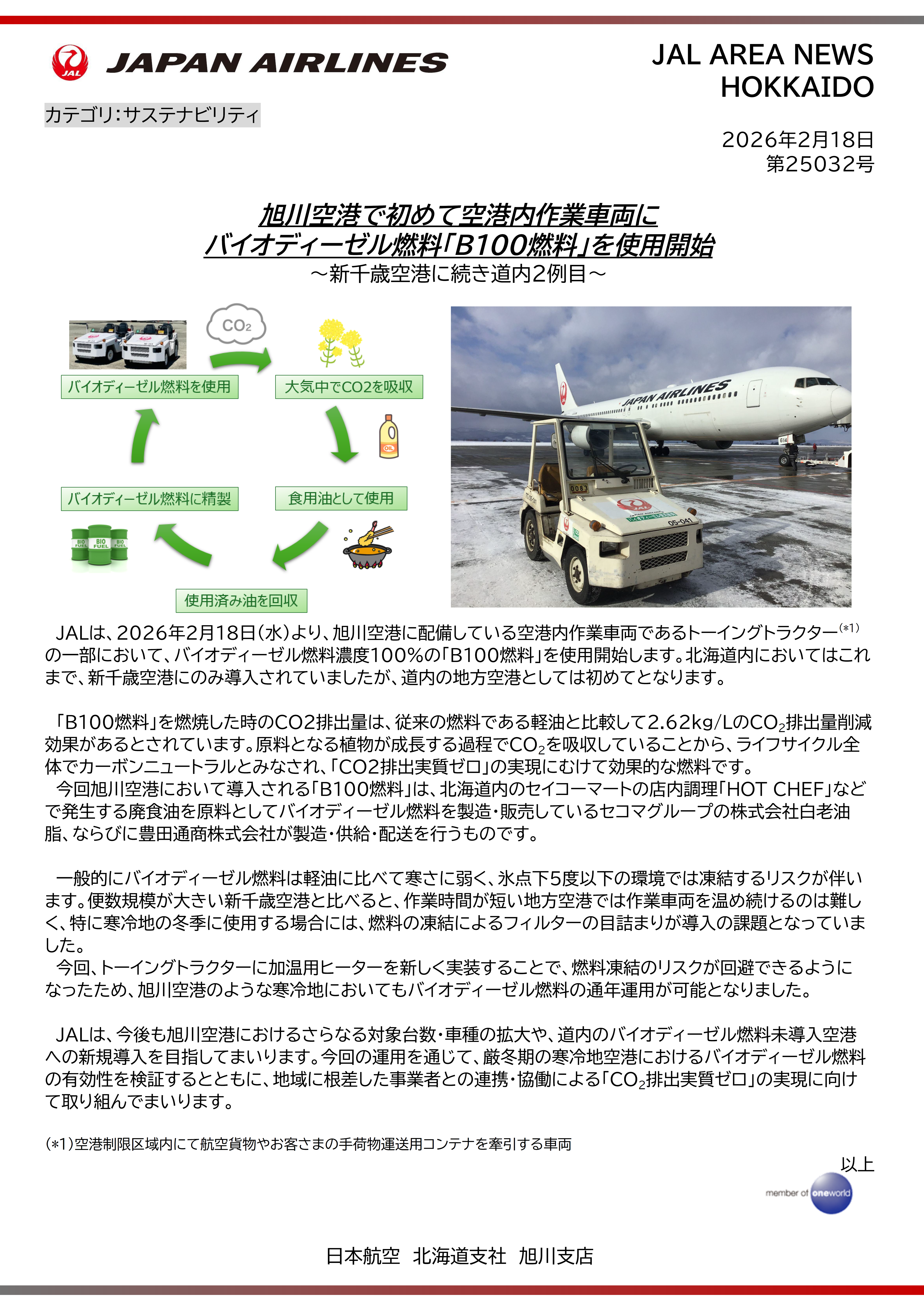 【北海道】旭川空港内で初めて空港内作業車両に バイオディーゼル燃料「B100燃料」を使用開始