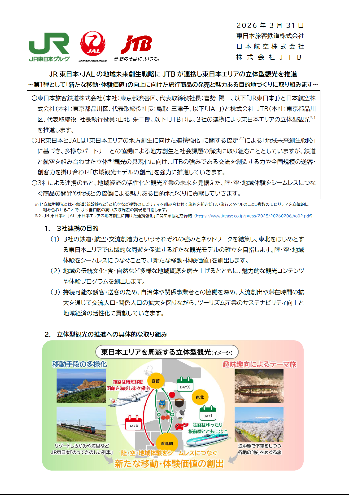 【東北】(共同リリース)JR 東日本・JAL の地域未来創生戦略に JTB が連携し東日本エリアの立体型観光を推進