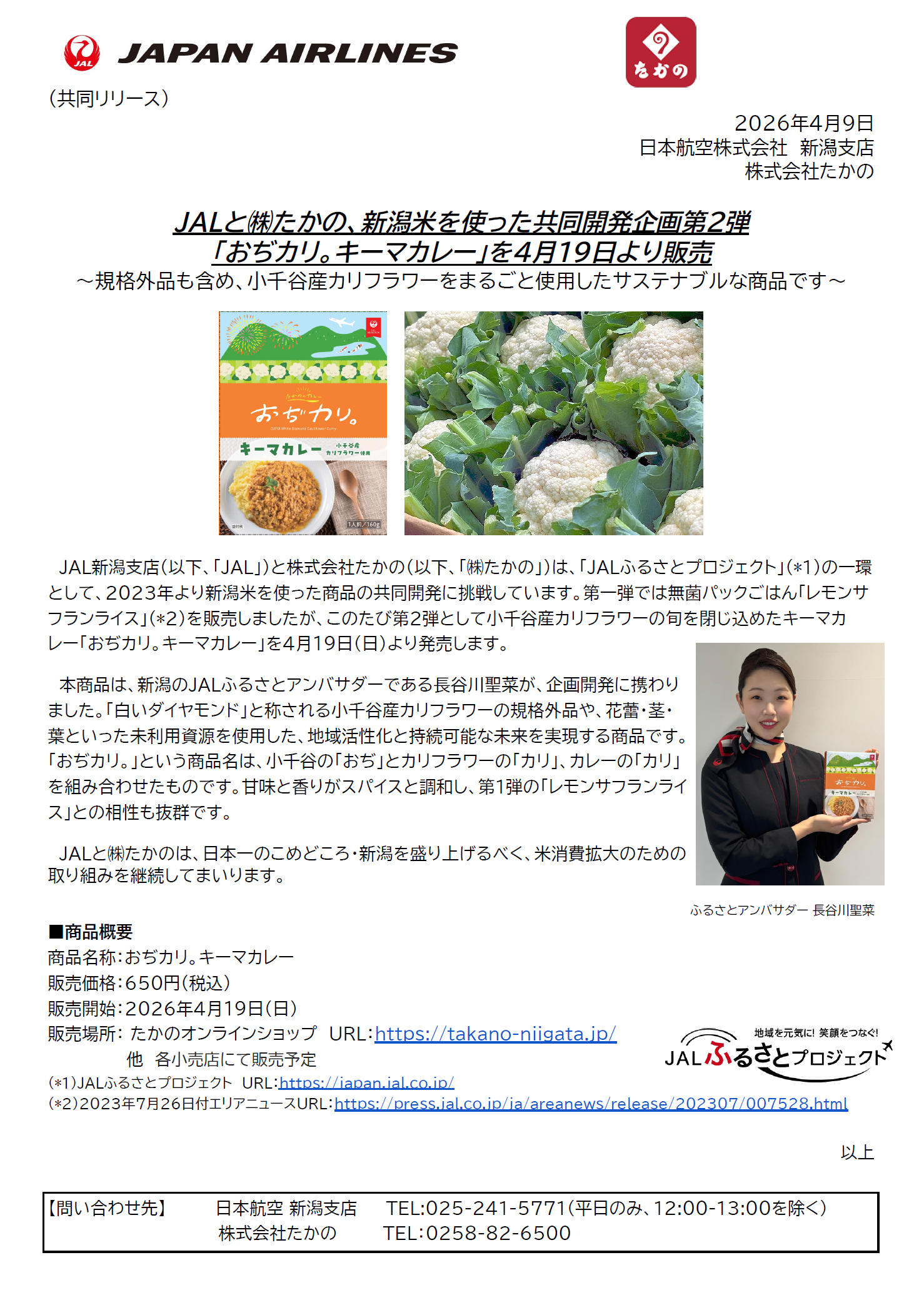 【新潟】(共同リリース)JALと㈱たかの、新潟米を使った共同開発企画第2弾 「おぢカリ。キーマカレー」を4月19日より販売