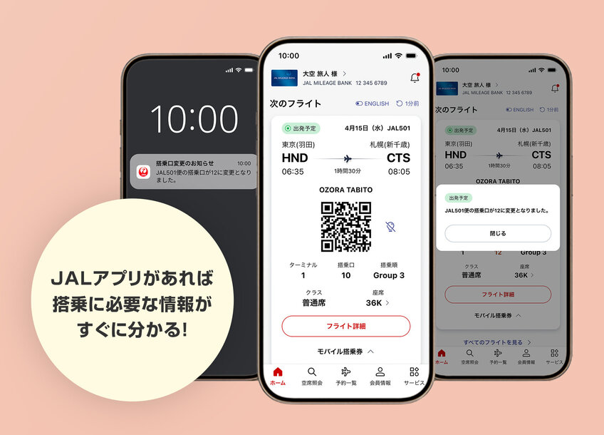 4月15日よりさらに便利になったJALアプリでは、ご搭乗に必要な情報が一目で分かります。突然の欠航や遅延、搭乗口の変更もリアルタイムに、プッシュ通知で的確にお知らせします。