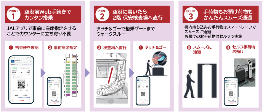 (*)デジタル技術の活用によるきめ細やかなヒューマンサービスと、最新技術の活用による効率的で快適なセルフサービスにより、JALが提供する新しい空港の形です。