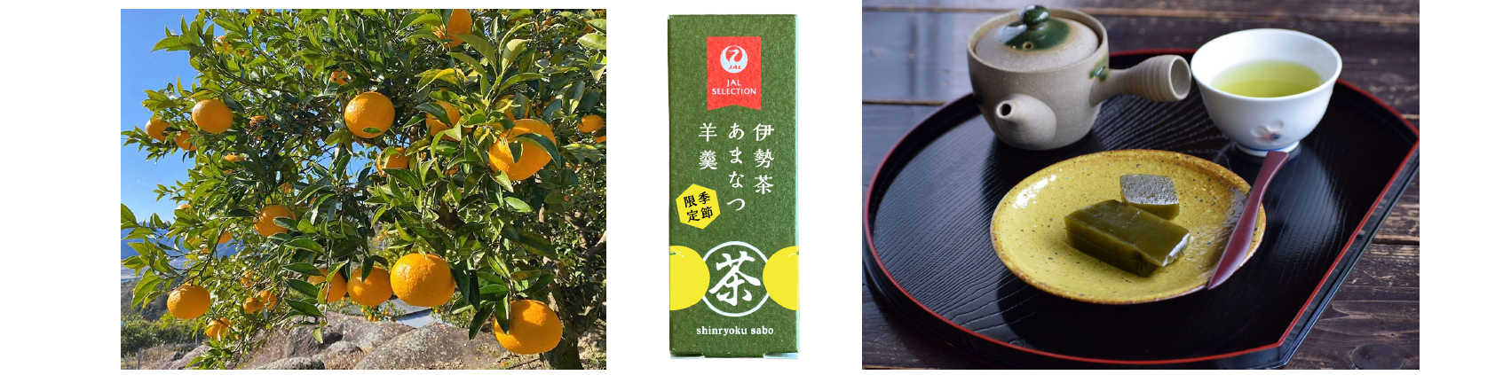 有限会社深緑茶房(本社:三重県松阪市、代表取締役:松倉大輔)と日本航空株式会社(本社:東京都品川区、代表取締役社長:鳥取三津子)は、三重県農林水産部の協力の下、 三重県の特産品「伊勢茶」の振興を通じて地域産品の活性化と三重県への誘客促進を目指す共同開発商品の第2弾、「伊勢茶あまなつ羊羹」を夏季限定で販売します。