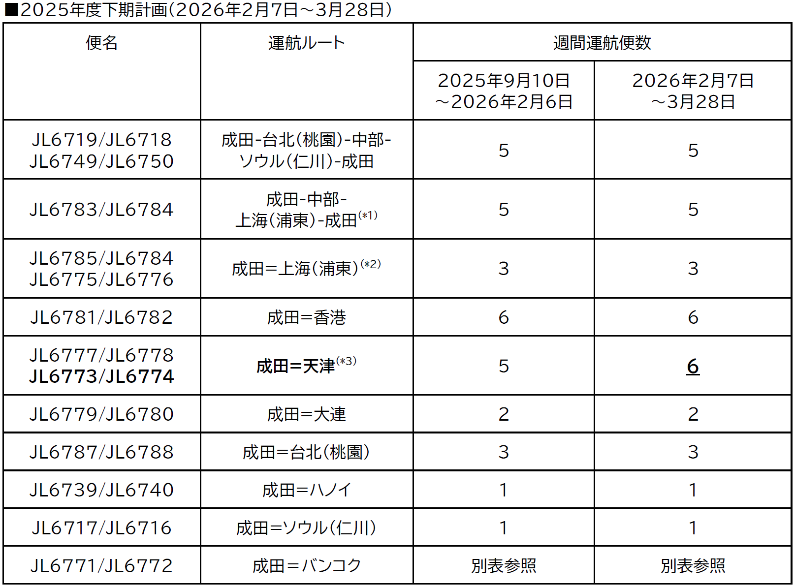 (*1)JL6783:成田-中部-上海(浦東)、JL6784:上海(浦東)-成田 (*2)JL6785/JL6784は週2便、JL6775/JL6776は週1便 (*3)JL6777/JL6778は週5便、JL6773/JL6774は週1便
