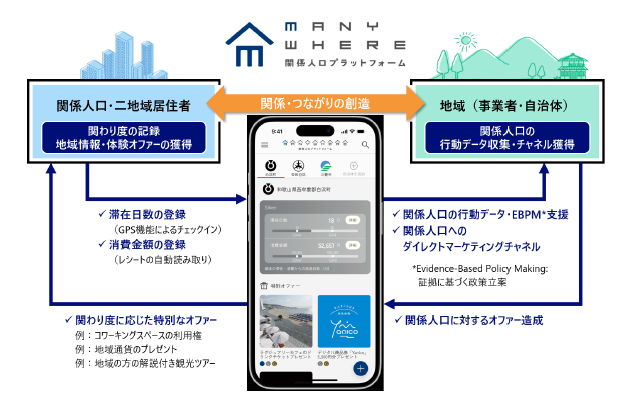 NRIデジタルが開発している関係人口プラットフォームアプリ「MANYWHERE」では、「関係人口の可視化」に向けて、二地域居住者と自治体や事業者の双方をつなぐサービスを実現します。二地域居住者は、自身の滞在履歴を記録できるだけでなく、アプリを介して、その地域との関わり度合に応じた特別な地域体験オファーを得ることができます。自治体や事業者にとっても、アプリ登録者の関与・活動状況をデータで把握することができるため、地域に関わる人々に向けたサービスのさらなる改善につなげていくことが可能です。
