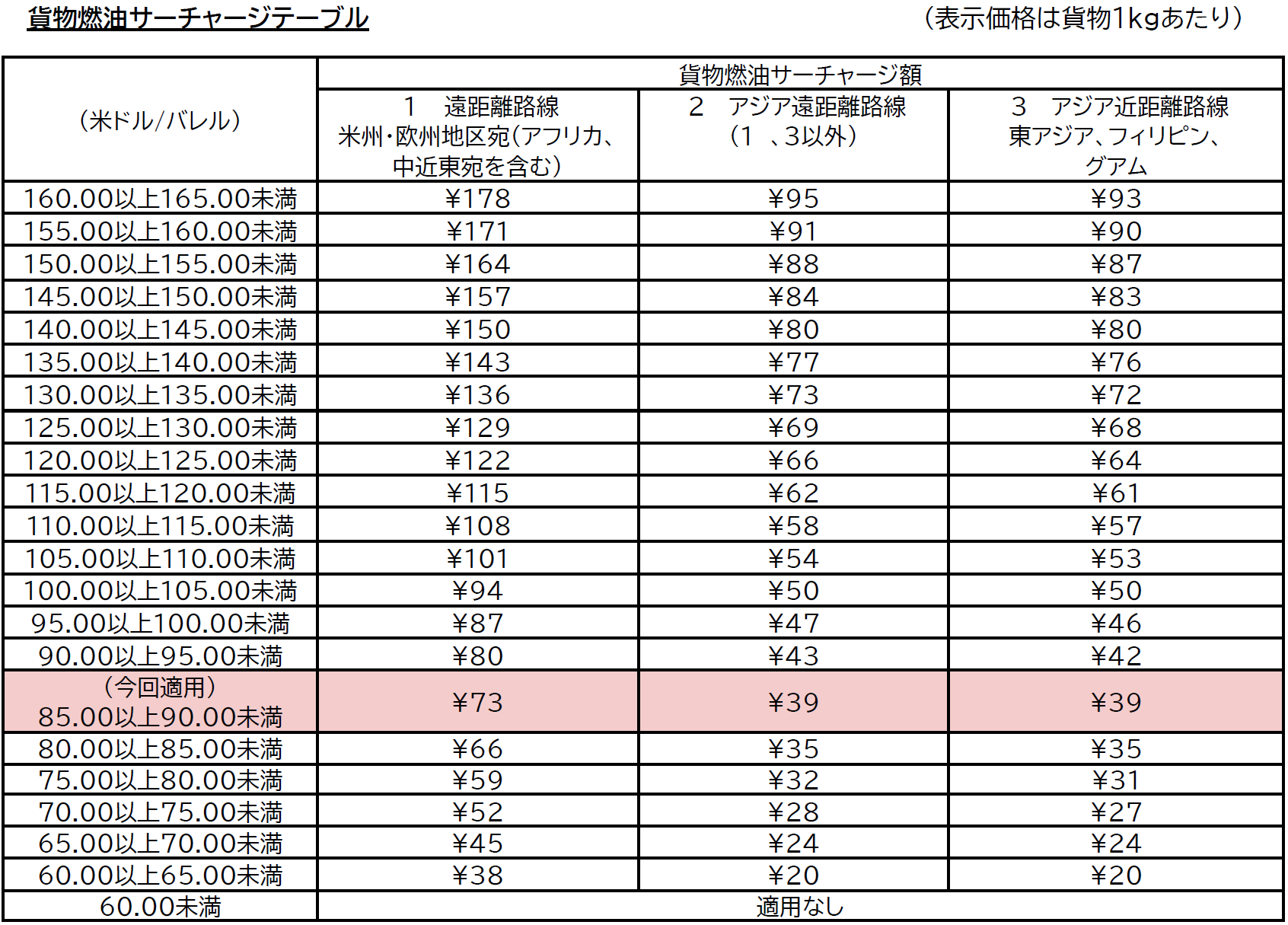 基準となる2025年2月のジェット燃料の平均価格が1バレルあたり88.91米ドルであったことから、燃油指標価格を「85.00以上90.00未満」とし、サーチャージ額は1kgあたり73円(米州・欧州など遠距離路線)、39円(アジア遠距離路線)、39円(アジア近距離路線)となります。