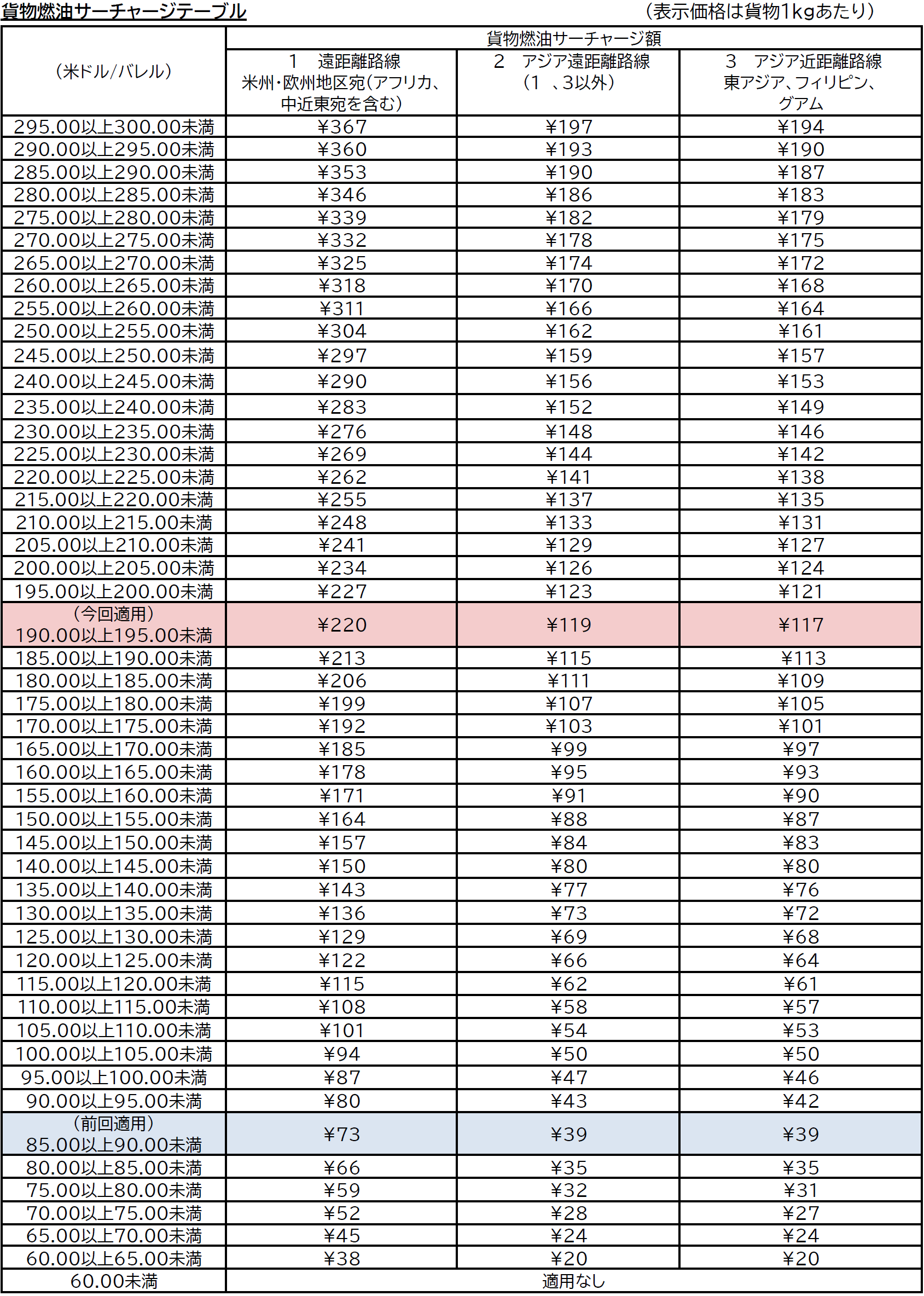 今後の燃油サーチャージに関しては、毎月適用日の1週間前を目途にJAL CARGO Webサイト内の「お知らせ」にてご案内します。