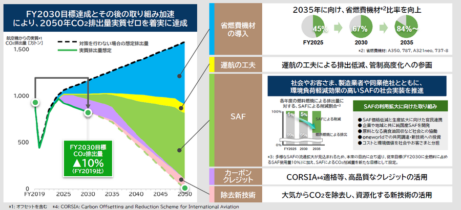 (*1)「2021-2025年度JALグループ中期経営計画」にて公表。詳細URL:https://press.jal.co.jp/ja/release/202105/006065.html (*2)Carbon Offsetting and Reduction Scheme for International Aviationの略で、ICAOが定めた国際的な炭素をオフセット・削減する枠組みで、国際航空を対象に、排出量のモニタリングと「2019年のCO₂排出量の85%を超過した分」の削減を義務付ける制度。本スキームで削減効果を主張するには、利用するSAF・クレジットがCORSIA適格である必要がある。